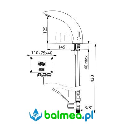 Stojąca bateria elektroniczna do umywalki, wyposażona w niezależną skrzynkę elektroniczną o klasie szczelności IP65.