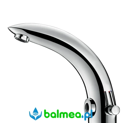 Stojąca bateria elektroniczna do umywalki, wyposażona w niezależną skrzynkę elektroniczną o klasie szczelności IP65.