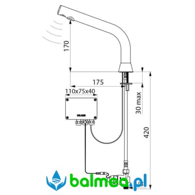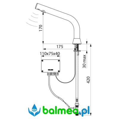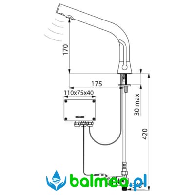Bezdotykowa bateria stojąca do umywalek częściowo wbudowanych w blat. Zasilana sieciowo lub na baterie litowe. Odrębna skrzynka elektroniczna IP65. Wydajność ustawiona na 3 l/min, przy czym istnieje możliwość regulacji wydajności od 1,5 do 6 l/min. Sito wypływowe wykonane z tworzywa antyosadowego. Spłukiwanie okresowe trwające 60 sekund co 24H po ostatnim użyciu zapobiega zaleganiu wody. Na końcu wylewki znajduje się detektor ruchu na aktywną podczerwień, który optymalizuję zużycie wody. Korpus wykonany z chromowanego mosiądzu. Wykończenie chromowane, czarne, matowe. Zasilanie wodne: wężyki PEX z filtrami i zaworami zwrotnymi Z3/8″. Wyposażony w antyblokadę wypływu.