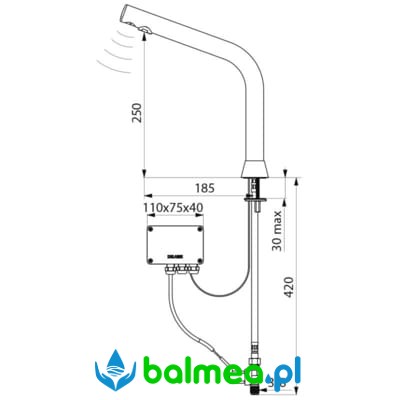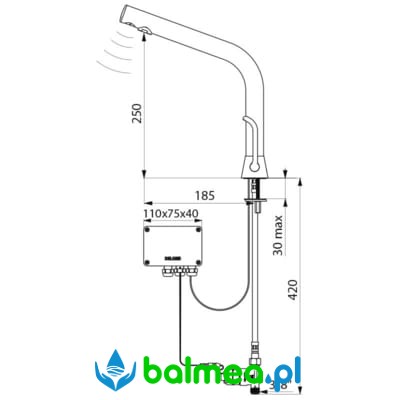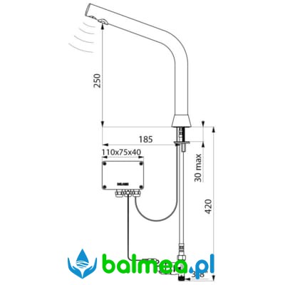 Bezdotykowa bateria stojąca przeznaczona do umywalek nadblatowych. Zasilana sieciowo lub na baterie litowe. Odrębna skrzynka elektroniczna IP65. Wydajność ustawiona na 3 l/min, przy czym istnieje możliwość regulacji wydajności od 1,5 do 6 l/min. Sito wypływowe wykonane z tworzywa antyosadowego. Spłukiwanie okresowe trwające 60 sekund co 24H po ostatnim użyciu zapobiega zaleganiu wody. Na końcu wylewki znajduje się detektor ruchu na aktywną podczerwień, który optymalizuję zużycie wody. Korpus wykonany z chromowanego mosiądzu. Wykończenie chromowane, czarne, matowe. Zasilanie wodne: wężyki PEX z filtrami i zaworami zwrotnymi Z3/8″. Wyposażony w antyblokadę wypływu.
