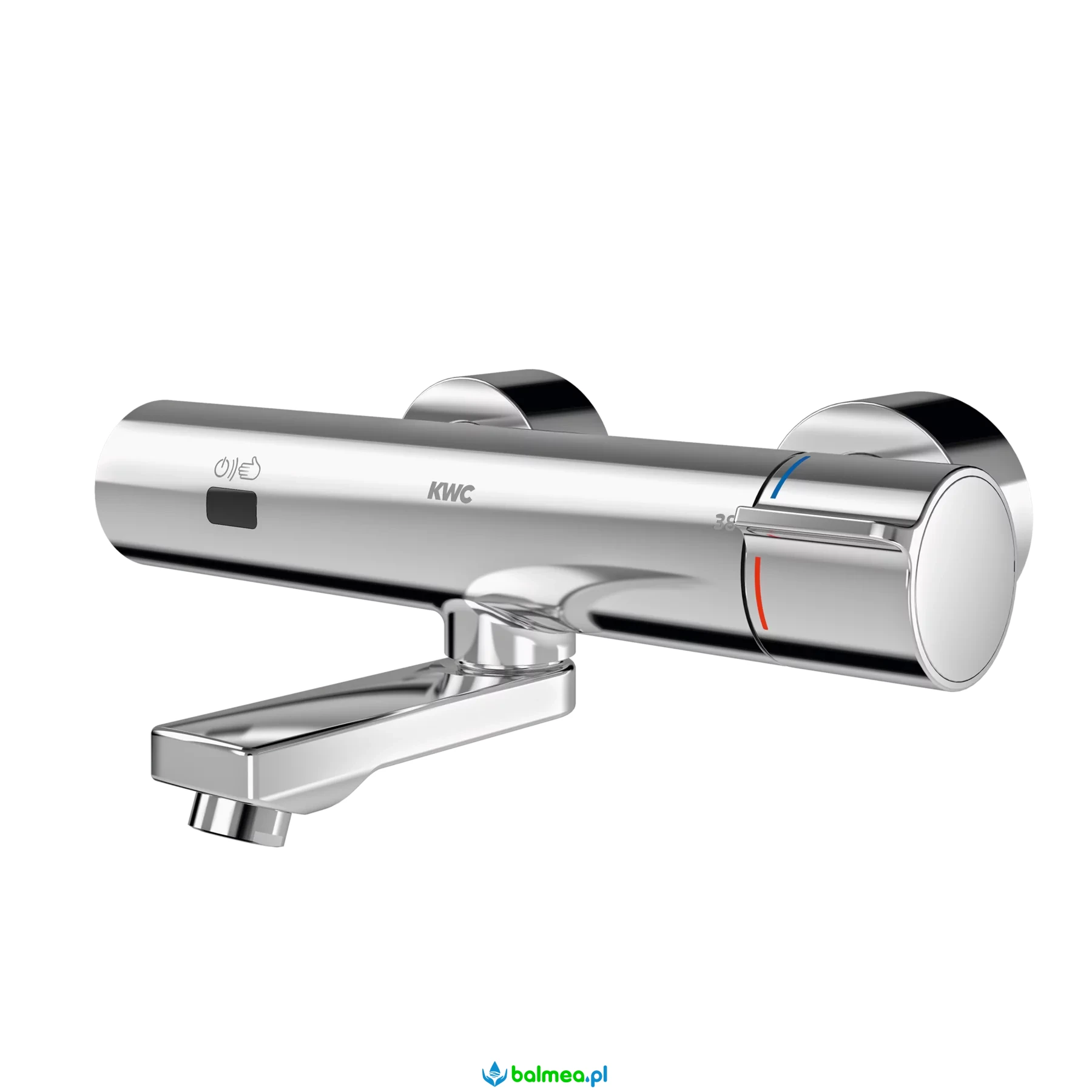 Bezdotykowa termostatyczna bateria ścienna z zasilaniem bateryjnym wykonana z polerowanego mosiądzu