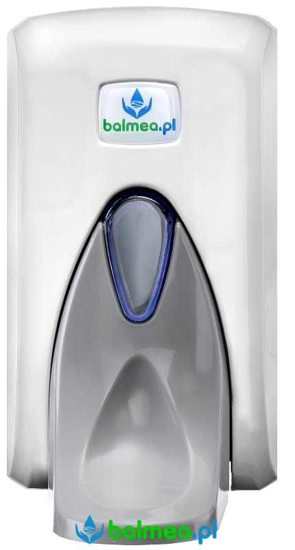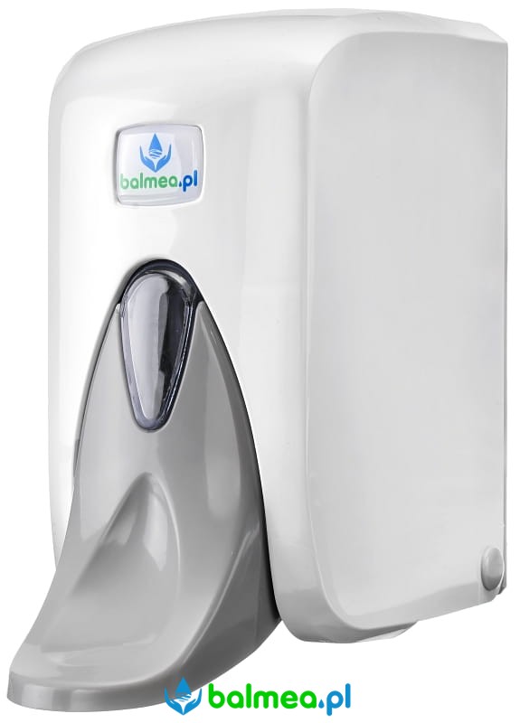 Klasyczny łokciowy dozownik mydła w płynie z linii Balmea POP w białym kolorze z szarymi elementami wykonany z mocnego tworzywa sztucznego ABS o pojemności 0.5 litra. Okienko dozownika pozwala kontrolować ilość płynu w zbiorniku. Korzystanie z tego rodzaju dozowników zalecane w miejscach, gdzie wymagana jest podwyższona higiena rąk. Może być stosowany z mydłami w tym mydłami dezynfekującymi. Nie jest odpowiedni do alkoholowych środków dezynfekujących.