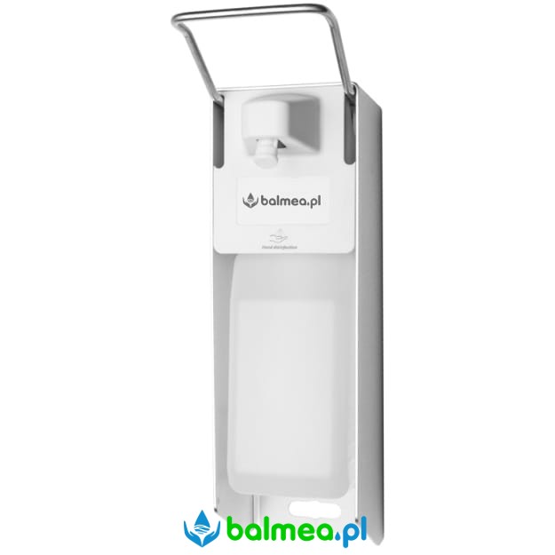 Dozownik do zamontowania do ściany lub stojaka podłogowego. Znajdujący się w komplecie zbiornik wielokrotnego uzupełniania, zapewnia łatwość uzupełniania płynu z kanistra lub szybką wymianę na jednorazową butelkę z preparatem. Bezpośrednia kontrola pozostałej zawartości. Obudowa wykonana z aluminium bardzo estetycznie anodowanego na srebrny metalik. Ramię dźwigni pompki wykonane ze stali nierdzewnej. Zbiornik w kolorze opalizującym białym.