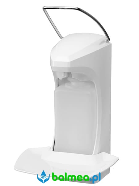 Dozownik łokciowy do płynów dezynfekcyjnych na bazie alkoholu. Wykonany z tworzywa sztucznego ABS w kolorze białym. Ramię dźwigni pompki wykonane za stali nierdzewnej. Dozownik nie jest zamykany na kluczyk. Płyny mogą być nalewane z kanistra do zbiornika 500ml, który jest w zestawie. Można również używać preparatów w standardowych eurobutelkach 500ml. Pojedyncza doza 1,5ml w postaci porcji płynu.