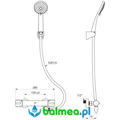 W skład zestawu wchodzi słuchawka natryskowa (nr 813) oraz chromowany, ruchomy uchwyt ścienny (nr 845). Zastosowano także złączkę antystagnacyjną WZ1/2" (nr 880), umożliwiającą automatyczne odprowadzanie wody z węża i słuchawki natryskowej poprzez montaż między dolnym przyłączem armatury a przyłączem węża.