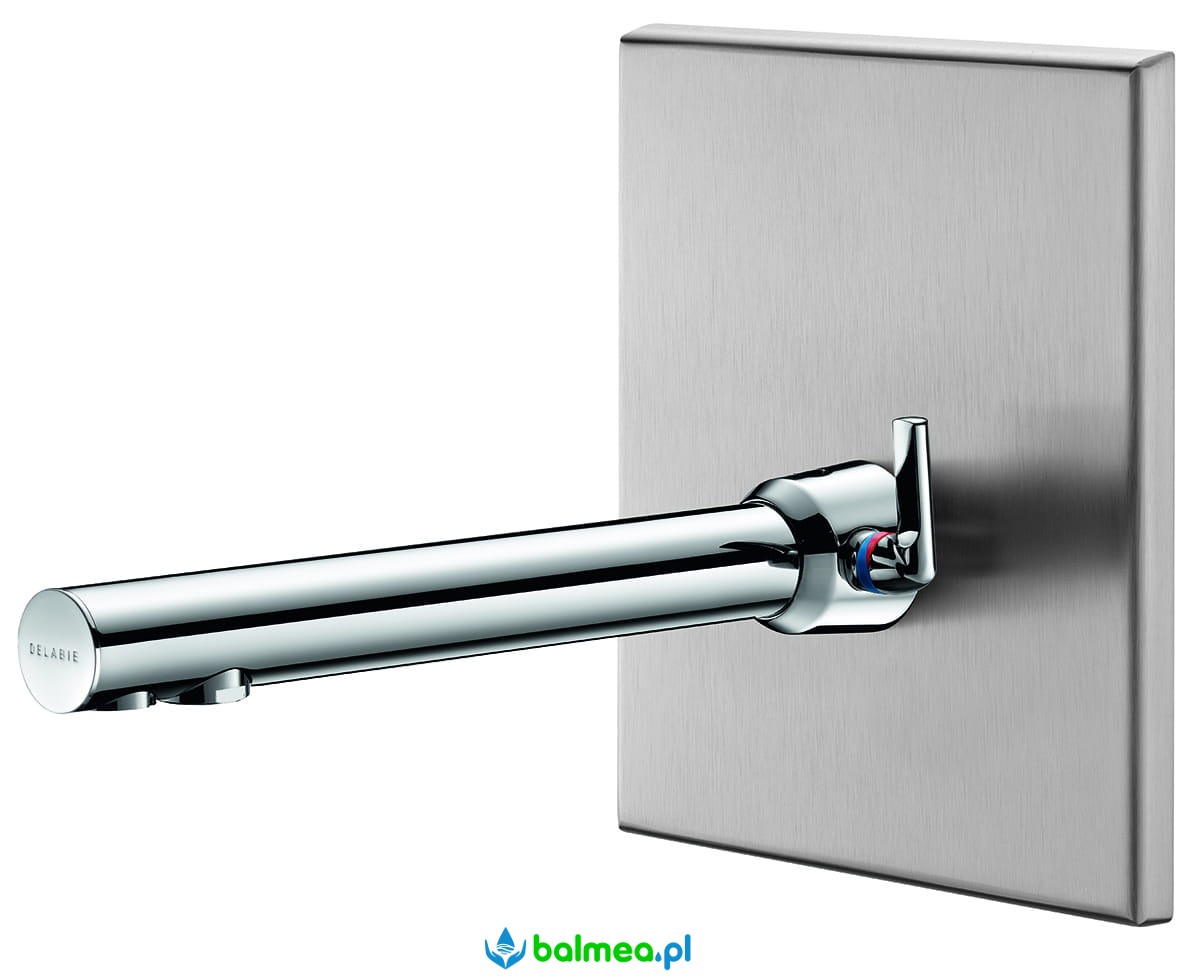 Zasilanie wodne: przyłącza Z3/8″ z filtrami i elektrozaworami. W komplecie kabel do detektora, wężyki zasilające i mocowania zgrupowane. Boczna dźwignia służy do regulacji temperatury wody z ogranicznikiem maksymalnej temperatury. Wylewka chromowana w odległości 24 cm od ściany. Instalacja podtynkowa, za płytą stalową inox o wymiarach 225 x 200 mm.