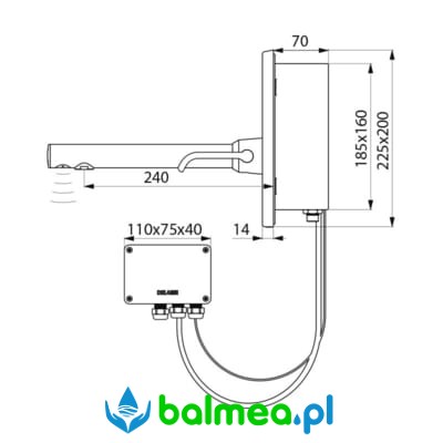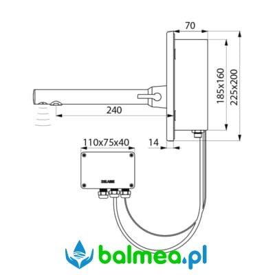Bateria bezdotykowa, podtynkowa do umywalki, sterowana czujnikiem IR z mieszaczem. Zasilana sieciowo z transformatorem 230/12V umieszczonym w osobnej puszce o stopniu ochrony IP65.