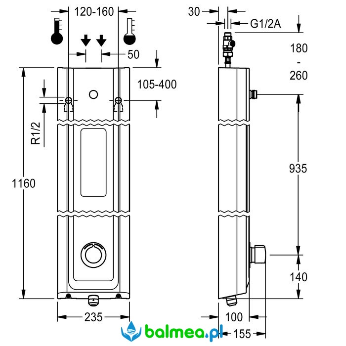 Wymiary obudowy: 235 × 1160 × 100 mm (szer. × wys. × głęb.).