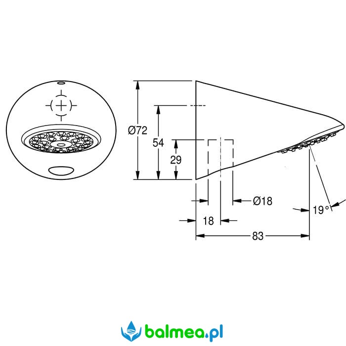 Głowica natryskowa DN 15 z sitem z tworzywa sztucznego, systemem szybkiego usuwania kamienia wapiennego i niskim poziomem powstawania mgiełki wodnej. Mosiądz polerowany, powierzchnia chromowana. Kąt nachylenia 19°