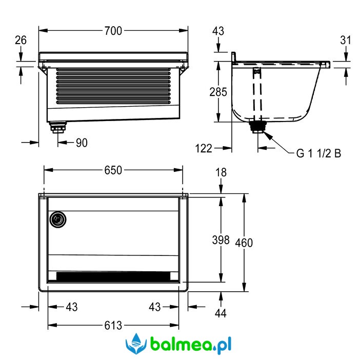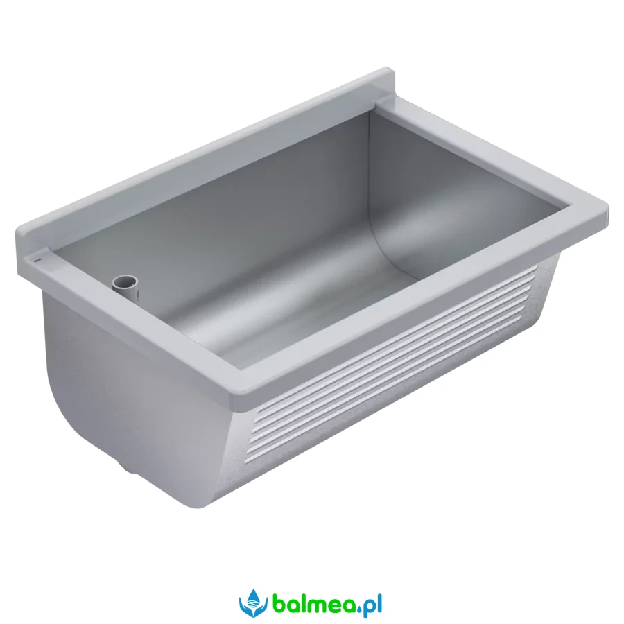 Ścianki boczne o grubości 1,2 mm ze zintegrowanymi wspornikami, bezspoinowe łączenia. Profilowana ścianka przednia bez półki na armaturę, bez przelewu. Obramowanie z szarego tworzywa sztucznego, tylna listwa o wysokości 43 mm. Odpływ z rurką przelewową G 1 1/2 B z tworzywa sztucznego po lewej stronie. W komplecie zestaw montażowy.