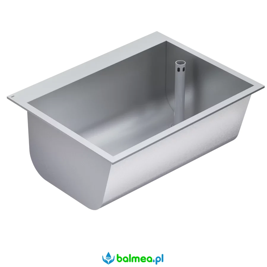 Nierdzewna komora gospodarcza SIRIUS do wbudowania w blat, wykonana ze stali szlachetnej o powierzchni jedwabiście matowej, grubość materiału 0,8 mm, grubość ścianek bocznych 1,2 mm. Bezspoinowe łączenia, gładka ścianka przednia, półka na armaturę 75 mm z otworem na armaturę 35 mm, bez przelewu. Odpływ z rurką przelewową G 1 1/2 B z tworzywa sztucznego po prawej stronie. W komplecie uszczelka i zaczepy mocujące do wbudowania w blat.