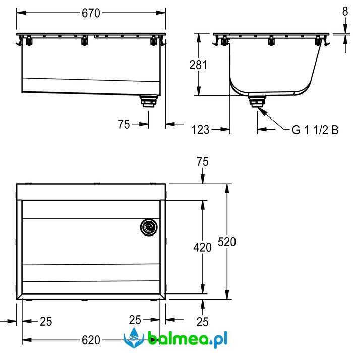 Wymiary niecki: 620 x 281 x 420 mm (szer. x wys. x głęb.)