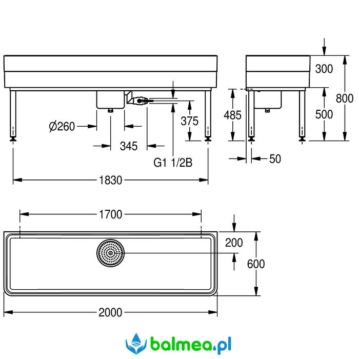 Wymiary całkowite: 2000 × 300/800 × 600 mm (szer. × wys. × głęb.)