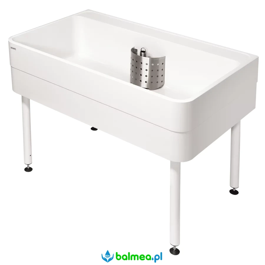 Komora warsztatowa wykonana z kompozytu mineralnego MIRANIT związanego żywicą syntetyczną, w kolorze białym. Niecka płynnie przechodzi w półkę na armaturę. Półka bez wywierconego otworu (z możliwością wykonania na miejscu, oznaczenia widoczne od spodu). Wyposażona w przelew rurkowy DN 40 x 200 mm z perforowaną osłoną. Konstrukcja oparta na spawanej podstawie powlekanej proszkowo w kolorze niecki. Nogi z regulacją wysokości. W komplecie zestaw montażowy.