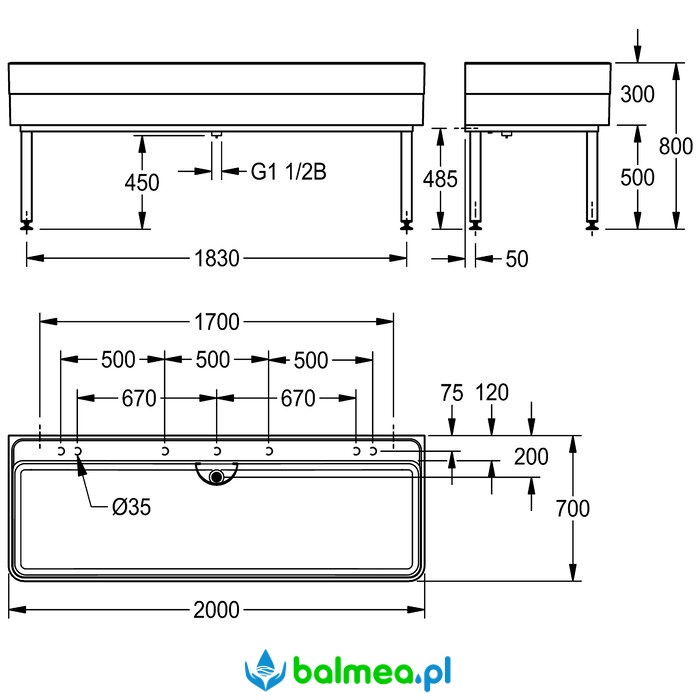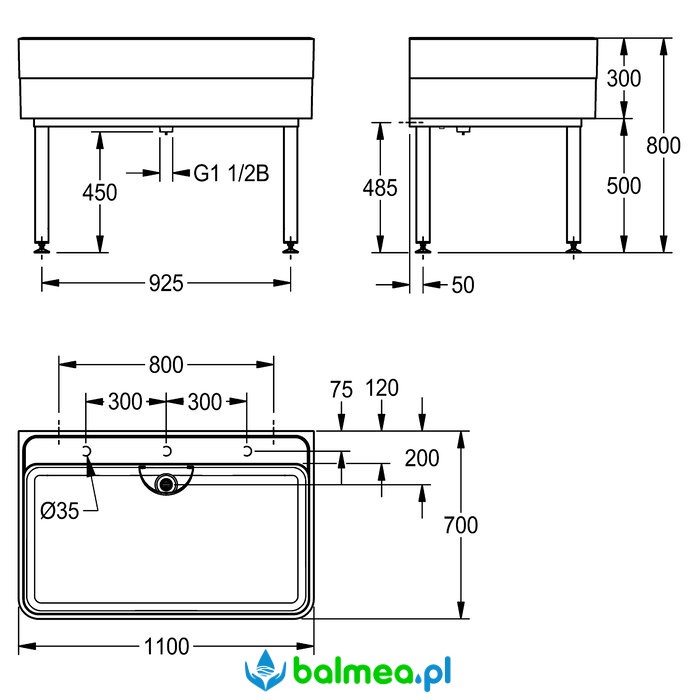Wymiary całkowite: 1100 x 300/800 x 700 mm (szer. x wys. x głęb.)