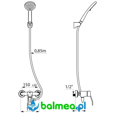 W skład zestawu wchodzi słuchawka natryskowa (nr 813), wąż (nr 834T3) oraz chromowany, ruchomy uchwyt ścienny (nr 845). Dodatkowo zastosowano złączkę antystagnacyjną WZ1/2", umożliwiającą automatyczne opróżnianie węża i słuchawki, co ogranicza rozwój bakterii.