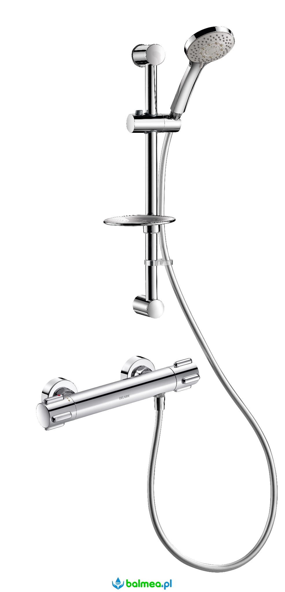 Słuchawka natryskowa na suwaku na chromowanym drążku natryskowym z mydelniczką, wężem i obręczą zapobiegająca upadkowi słuchawki natryskowej na posadzkę.