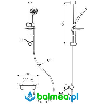 W skład zestawu wchodzi słuchawka natryskowa na suwaku (nr 813), chromowany drążek natryskowy (nr 821), mydelniczka, wąż natryskowy (nr 836T1) oraz obręcz zabezpieczająca przed opadaniem słuchawki na posadzkę (nr 830).