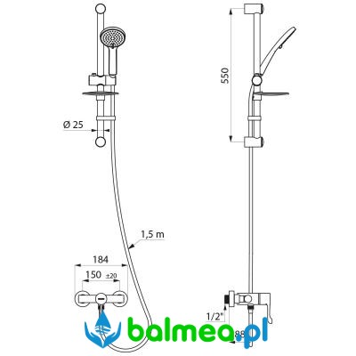 W skład zestawu wchodzi słuchawka natryskowa na suwaku (nr 813), chromowany drążek natryskowy (nr 821) z mydelniczką oraz wąż (nr 836T1). Dodatkowo zastosowano obręcz zapobiegającą opadaniu słuchawki natryskowej na posadzkę (nr 830).