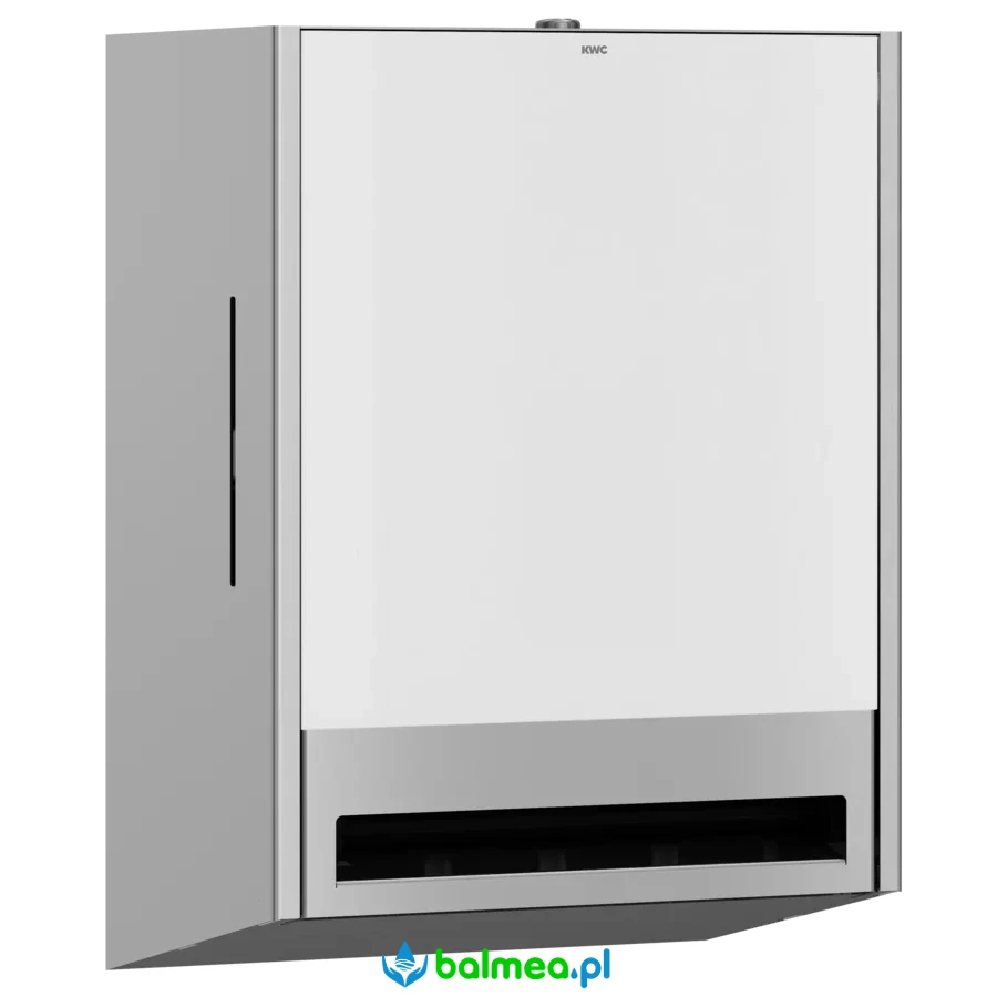 Obudowa ze stali o grubości 1,2 mm o uszlachetnionym wykończeniu INOXPlus redukującym odciskanie się palców i ułatwiającym utrzymanie w czystości (easy to clean). Podajnik przeznaczony do montażu ściennego. Pomieści rolkę o maksymalnej średnicy 200 mm i szerokości 205 mm. Posiada okienko do kontroli zużytego ręcznika oraz zamek bębenkowy z uniwersalnym kluczykiem KWC. Długość perforacji papieru 260 mm. Urządzenie posiada regulowany uchwyt na rolkę, który ułatwia dozowanie papieru. W komplecie materiały montażowe.