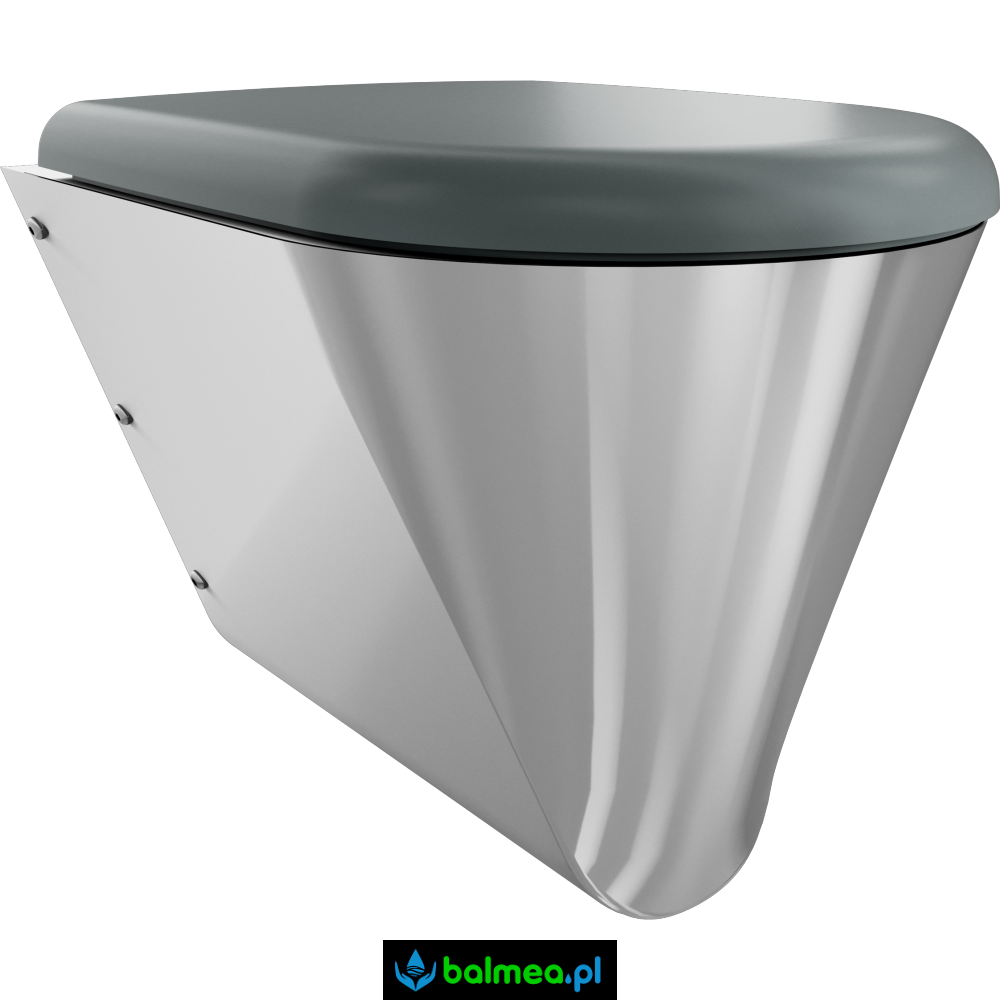 Miska ustępowa, wisząca ze stali szlachetnej o powierzchni szlifowanej, matowej. Przeznaczona do użytku w toaletach publicznych o dużym natężeniu ruchu i w miejscach narażonych na dewastację jak dworce lotnicze i kolejowe, stadiony, toalety bezobsługowe. Stal o grubości 1,6 mm, płyta montażowa zgodna z normą EN33 oraz specjalne śruby mocujące misę do stelaża i osłaniające odpływ zabezpieczają przed przypadkowymi uszkodzeniami, celowym demontażem lub wandalizmem. Krawędź spłuczkowa ukryta, górne krawędzie zaokrąglone, opadające do wewnątrz dla zachowania czystości miski i otoczenia.