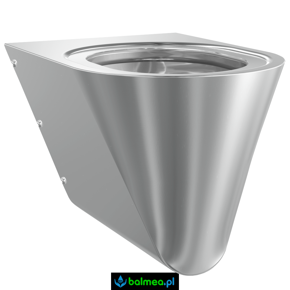 Miska ustępowa, wisząca ze stali szlachetnej o powierzchni szlifowanej, matowej. Przeznaczona do użytku w toaletach publicznych o dużym natężeniu ruchu i w miejscach narażonych na dewastację jak dworce lotnicze i kolejowe, stadiony, toalety bezobsługowe. Stal o grubości 1,6 mm, płyta montażowa zgodna z normą EN33 oraz specjalne śruby mocujące misę do stelaża i osłaniające odpływ zabezpieczają przed przypadkowymi uszkodzeniami, celowym demontażem lub wandalizmem. Krawędź spłuczkowa ukryta, górne krawędzie zaokrąglone, opadające do wewnątrz dla zachowania czystości miski i otoczenia.
