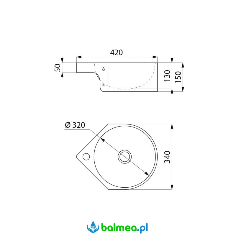 Wymiary umywalki: 340 x 420 x 150 (dł. x szer. x wys.)