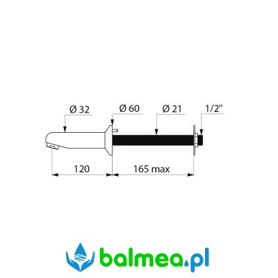 Nieruchoma wylewka Ø32 z przyłączem Z½", przeznaczona do instalacji zaściennych o głębokości do 165 mm.