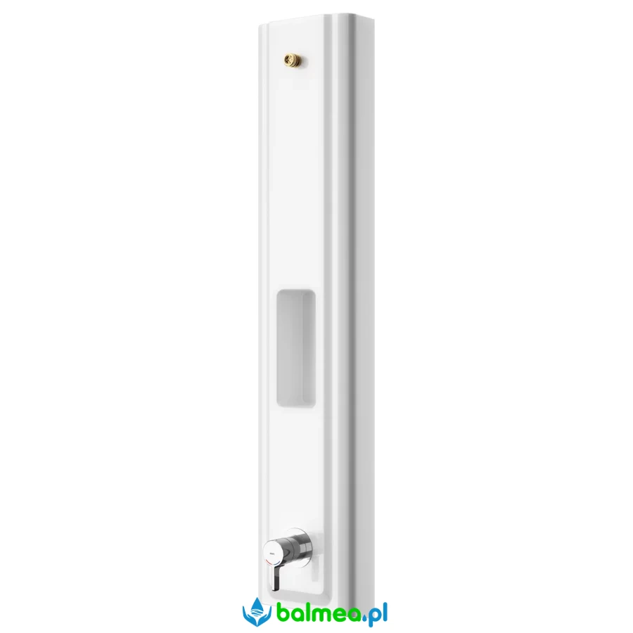 Panel natryskowy F5L-Therm wykonany z tworzywa mineralnego MIRANIT, przeznaczony do montażu natynkowego, wyposażony w jednouchwytową baterię termostatyczną DN 15 oraz króciec przyłączeniowy do głowicy natryskowej.