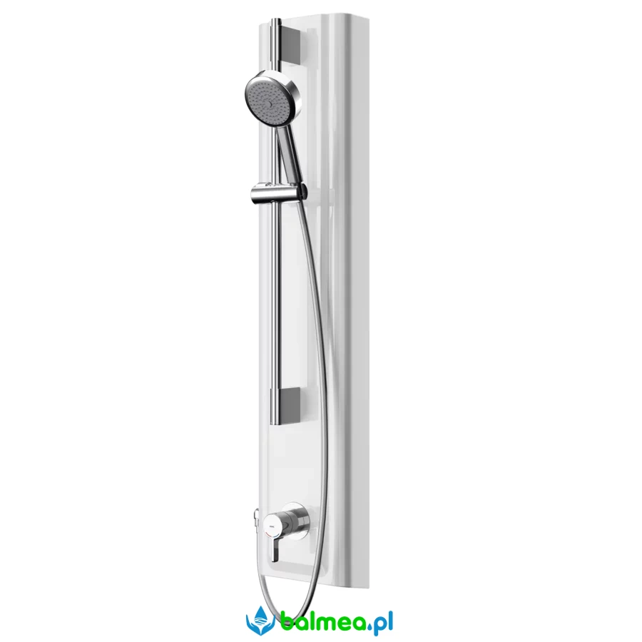 Wstępnie zmontowany drążek natryskowy z mosiądzu chromowanego posiada uchwyt na słuchawkę o regulowanej wysokości. Słuchawka natryskowa z tworzywa sztucznego ma strumień typu deszczownica o średnicy 110 mm, z wężem długości 900 mm. Obudowa panelu ma wypukłą powierzchnię funkcyjną i wykonana jest z kompozytu mineralnego MIRANIT o gładkiej, pozbawionej porów powierzchni (odpornej na temperaturę do 80 °C), kolor biel alpejska.