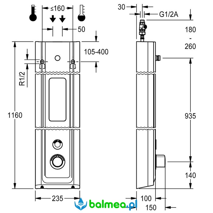 Sterowanie elektroniczne umożliwia wygodną obsługę i precyzyjną kontrolę temperatury. Panel podłącza się do instalacji ciepłej i zimnej wody.