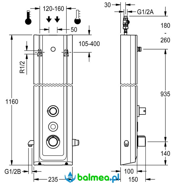 Wymiary obudowy: 235 × 1160 × 100 mm (szer. × wys. × głęb.).