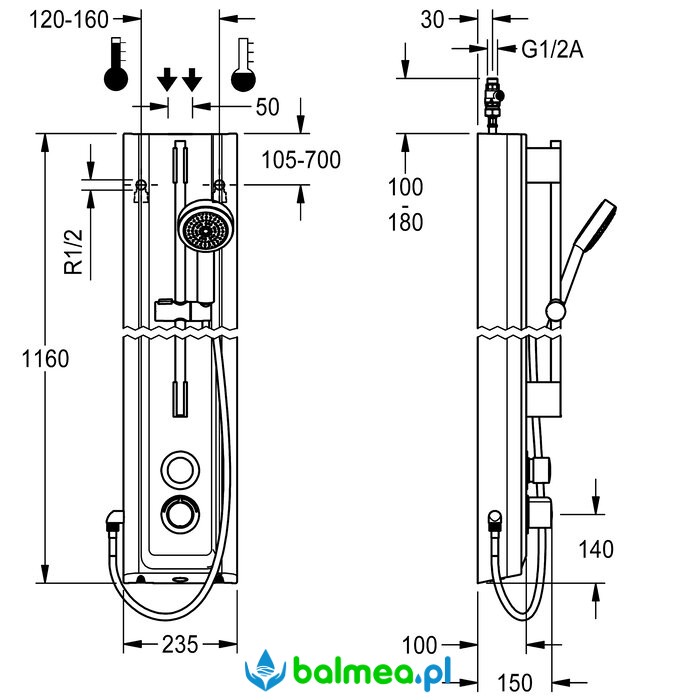 Wymiary obudowy: 235 × 1160 × 100 mm (szer. × wys. × głęb.).