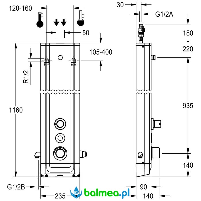 Wymiary obudowy: 235 × 1160 × 90 mm (szer. × wys. × głęb.).
