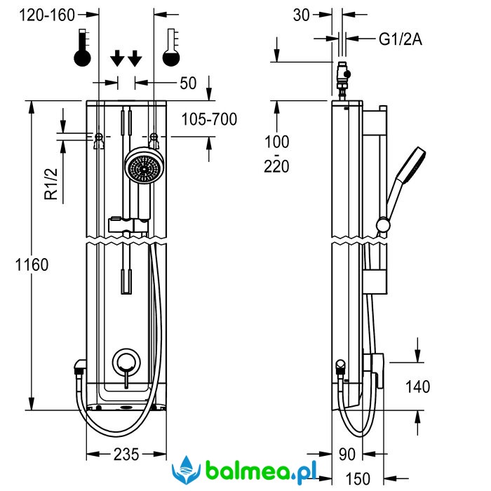 Panel natryskowy ze stali szlachetnej ze słuchawką natryskową o wymiarach 235 x 1160 x 90 mm