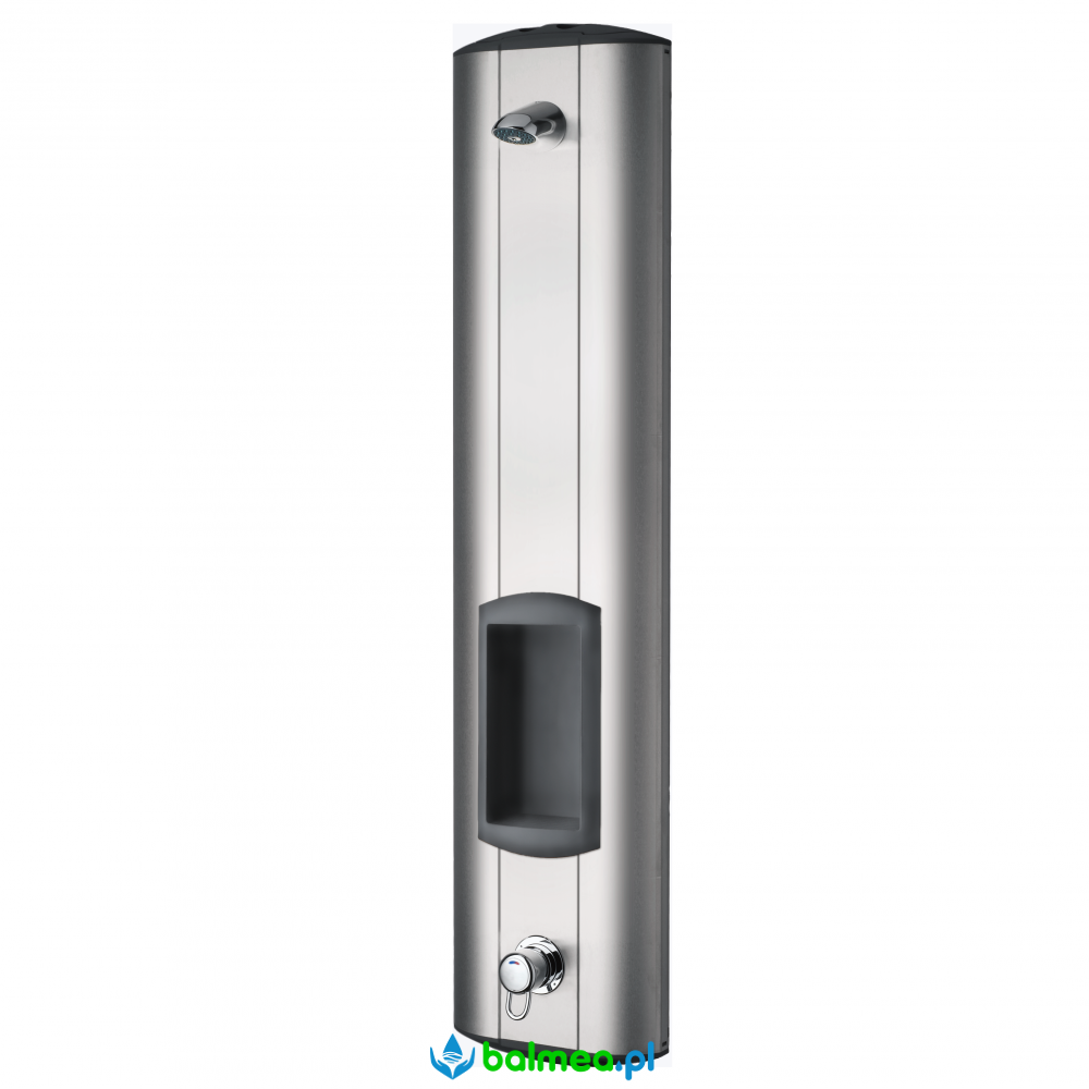 Panel prysznicowy naścienny Franke ze stali szlachetnej, matowy. Podłączenie do ciepłej i zimnej wody. Bateria z dźwignią regulacji temperatury i ilości wody. Regulowany czas przepływu wody. Widoczne elementy baterii polerowane i chromowane. Głowica prysznicowa AQUAJET-Slimline (0,20 l/s) z sitem z tworzywa sztucznego. Regulator prędkości przepływu wody (0,15 l/s). Podłączenie wody elastycznymi przewodami wysokociśnieniowymi z regulatorem ilości przepływu wody wyposażonym w blokadę. Obudowa z profilowanej stali szlachetnej ze zintegrowaną półką na szampon/żel pod prysznic oraz modelowanymi osłonami z tworzywa sztucznego.