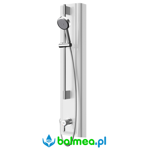 Panel prysznicowy z jednouchwytową baterią termostatyczną i słuchawką natryskową do montażu natynkowego. Podłaczenie do ciepłej i zimnej wody. Panel wykonany z tworzywa mineralnego, natomiast elementy baterii, słuchawka i drążek z mosiądzu chromowanego i polerowanego. Istnieje możliwość podłączenia opcjonalnego podzespołu higienicznego do automatycznego płukania, konieczny do tego dodatkowy obejściowy kartusz z zaworem elektromagnetycznym. Dodatkowo panel wyposażony w termostatycznie sterowany kartusz z elementem rozprężnym oraz wyłacznikem bezpieczeństwa w przypadku przerwy w dopływie zimnej wody. Zabezpieczenie przed przekręceniem ogranicznika temperatury. Regulowany uchwyt słuchwaki prysznicowej. Wąż słuchawki ma długość 900mm, średnica deszczownicy 110 mm. Wężyki przyłączeniowe z zamykanymi regulatorami przepływu wody, z zaworem zwrotnym i sitkiem.