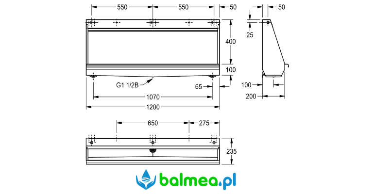 Ilość potrzebnej wody do spłukiwania 0,15 l/sek. na metr długości pisuaru. Rynna posiada dwustronny spadek w kierunku środkowego odpływu sitkowego G 1 1/2 B. Niewidoczna rura spłukująca. Zestaw posiada listwę zaczepową, zestaw montażowy i przyłącze wodne. Syfon należy zakupić osobno.