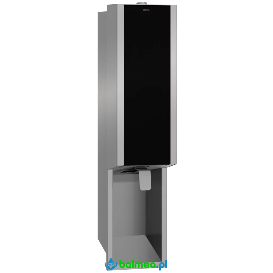Podtynkowy dozownik mydła w płynie KWC (Franke) EXOS ze stali nierdzewnej o powierzchni jedwabiście matowej z panelem przednim z czarnego, hartowanego szkła.