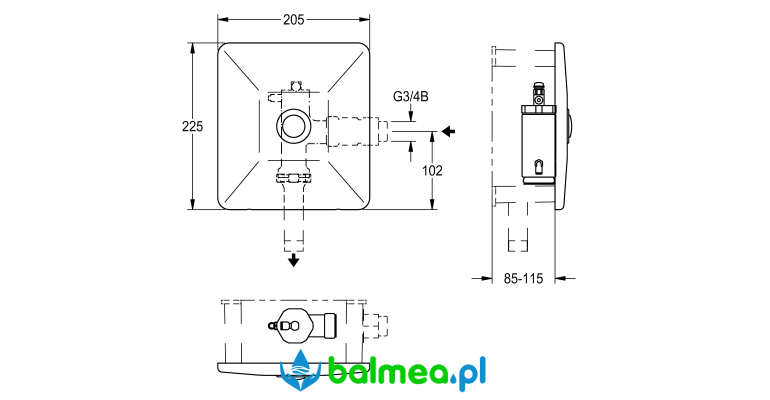 Panel przedni wraz z przyciskiem wykonany ze stali szlachetnej o wymiarach 205 x 225 mm zabezpieczony śrubami antykradzieżowymi. Zestaw zawiera ciśnieniowy zawór spłukujący oraz ramkę mocującą z uszczelką profilowaną. Montaż w samodzielnej puszce montażowej lub w bezzbiornikowym stelażu do misek Wc z puszką.