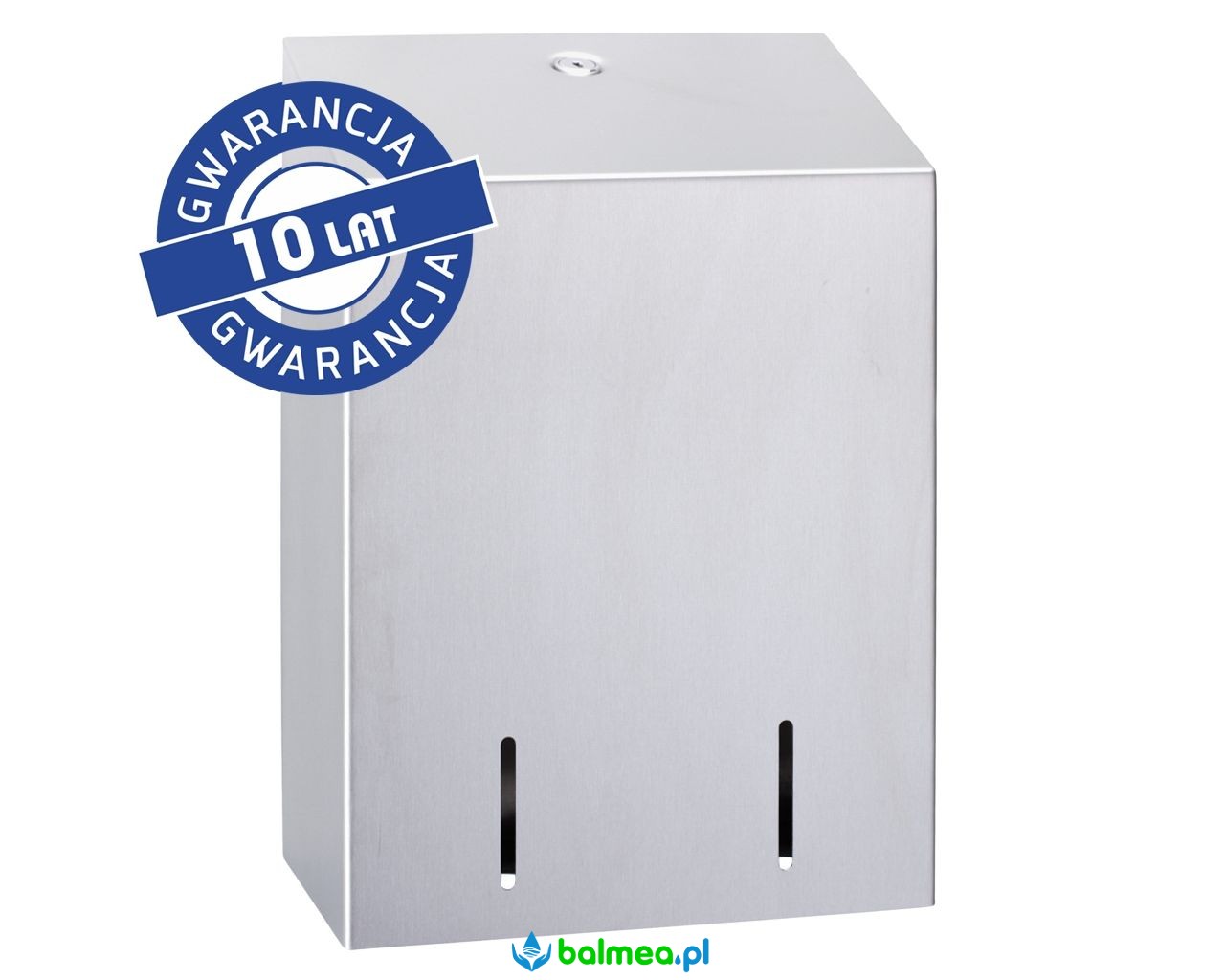 Pojemnik na papier toaletowy w listkach, którego obudowa wykonana jest ze stali nierdzewnej matowej. Mieści 900 sztuk pojedynczych porcji papieru, który dozowany jest ekonomicznie listek po listku. Posiada okienko do kontroli ilości papieru. Pojemnik zabezpieczony trwałym stalowym zamkiem bębenkowym zlicowanym z powierzchnią urządzenia.