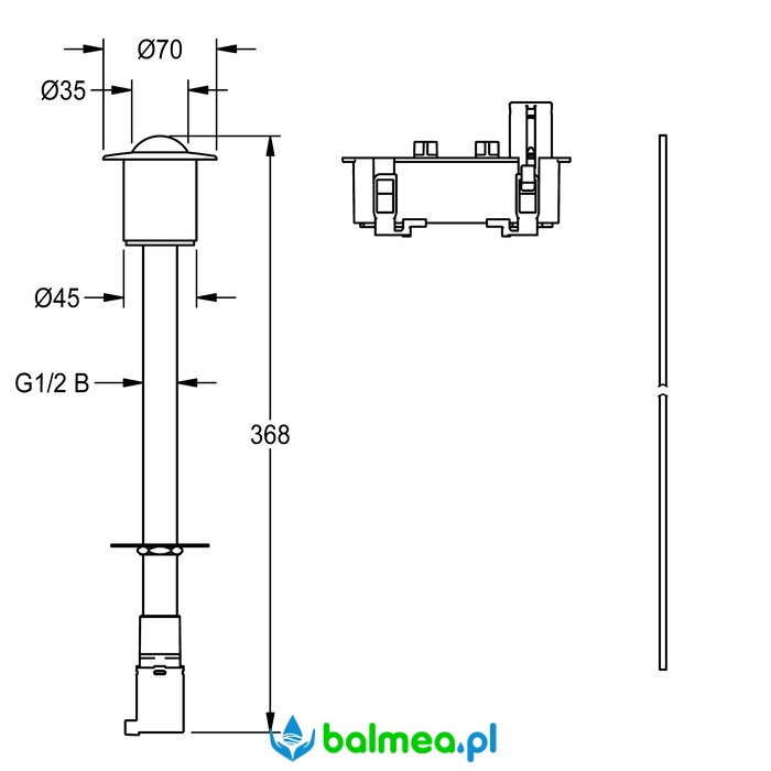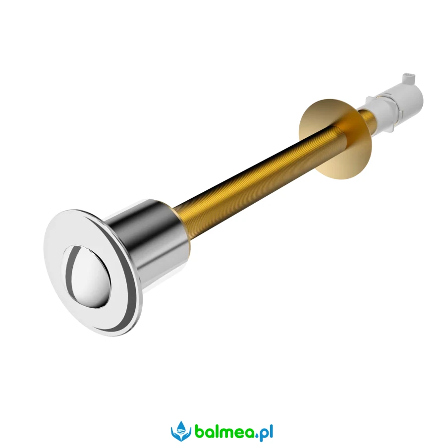 Przycisk spłukujący do zbiorników WC montowanych za ścianą w pomieszczeniu technicznym, sterowany pneumatycznie. Przeznaczony do obiektów zagrożonych wandalizmem. Umożliwia uruchomienie jednopojemnościowego spłukiwania za pomocą przycisku z funkcją samozamykania, do ścian o grubości od 60 do 270 mm. Wykonany z mosiądzu polerowanego chromowanego. W zestawie podnośnik pneumatyczny, przewód sterujący pneumatyczny o długości 2350 mm oraz komplet montażowy.