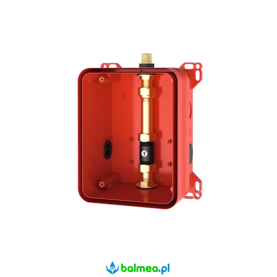 Puszka systemowa R3 przeznaczona do podtynkowej zabudowy mechanizmów podstawowych armatur natryskowych DN 15 bez mieszacza. Umożliwia podłączenie do wstępnie zmieszanej wody ciepłej lub wody zimnej.