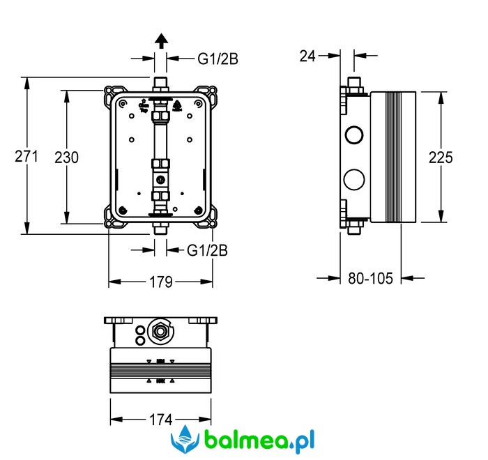 Obudowa wykonana z trwałego tworzywa sztucznego o wymiarach 174 × 225 mm, wyposażona w złącza przyłączeniowe. W zestawie znajduje się osłona ochronna zabezpieczająca elementy instalacji podczas prac budowlanych oraz komponent umożliwiający płukanie instalacji i przeprowadzenie próby szczelności.