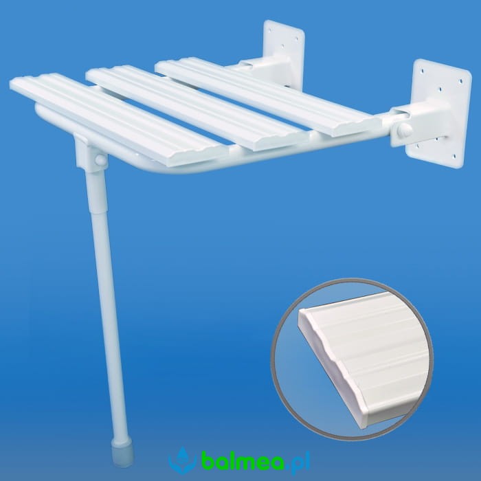 wykonane ze stali węglowej z powłoką lakierniczą w białym kolorze. Bezpieczne i funkcjonalne siedzisko przeznaczone do montażu naściennego w kabinie prysznicowej z podpirą nożną. Pozwala na komfort w toalecie osobom z ograniczeniami ruchowymi, osobom niepełnosprawnym, starszym. Gdy nie jest używane, po złożeniu na ścianę, pozostaje w pozycji pionowej nie zajmując miejsca pod prysznicem. W komplecie dołączone wszystkie potrzebne elementy montażowe.