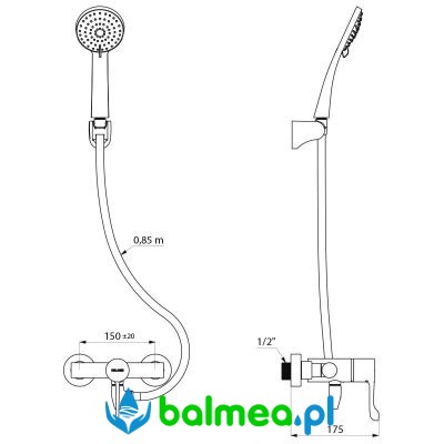 Wypływ wody ustawiony jest na 9 l/min. Bateria wykonana jest z chromowanego mosiądzu i wyposażona w uchwyt HIGIENA L.100. Dolne przyłącze do węża natryskowego Z1/2" oraz ścienne mocowanie ze standardowymi mimośrodami Z1/2"–Z3/4" zapewniają łatwy montaż.
