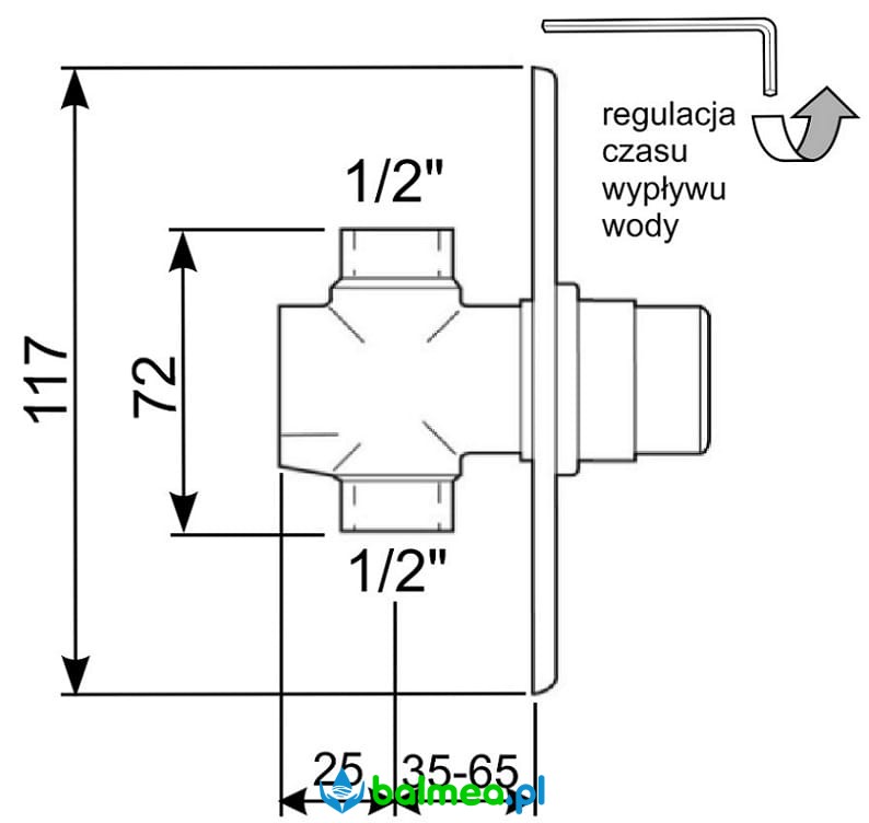 Podłączenie od spodu do wody wstępnie zmieszanej lub zimnej. Regulacja czasu wypływu wody od 5 do 50 sekund bez konieczności demontażu głowicy zaworu i odcinania dopływu wody. Korpus mosiężny polerowany, elementy zewnętrzne chromowane. Przyłącze gwint wewnętrzny G 1/2. Okrągła rozeta maskująca o średnicy 117mm z regulacją głębokości pierścieniem dociskowym do 30 mm.