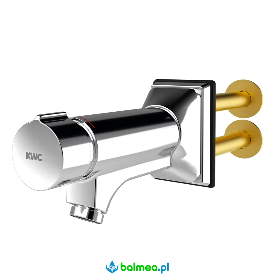 KWC F5S-Mix – Samozamykająca bateria ścienna DN 15 do umywalek z mieszaczem i wylewką ukośną, przeznaczona do montażu od strony pomieszczenia technicznego idealna do obiektów zagrożonych wandalizmem