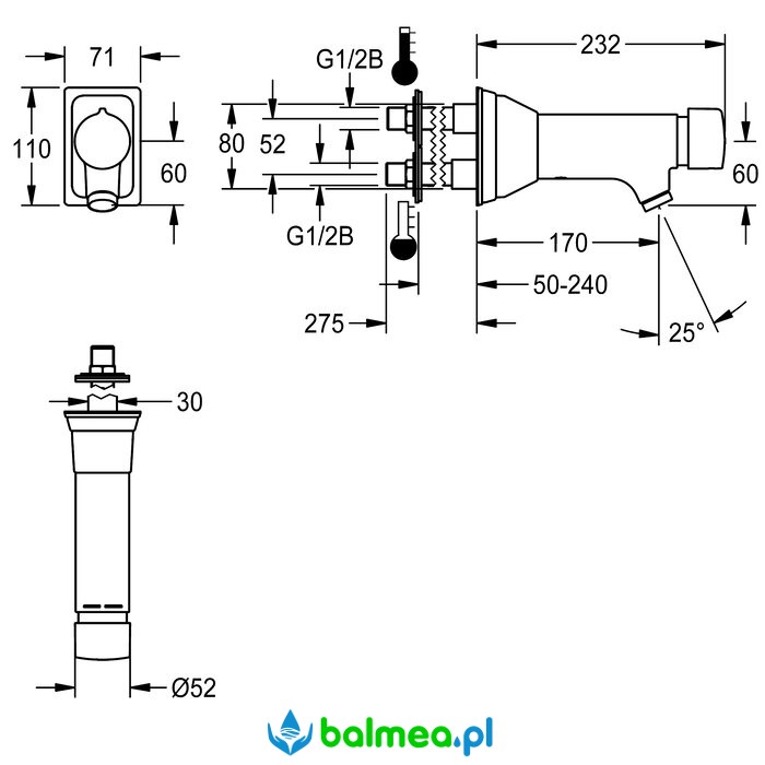 Wykonana w całości z metalu, mosiądz polerowany chromowany. Perlator z zabezpieczeniem antykradzieżowym, przepływ 6,0 l/min. Kołnierz przyłączeniowy z elementami przejściowymi do ścian o grubości 50–240 mm. Wersje do innych grubości ścian dostępne na zapytanie.