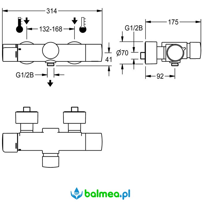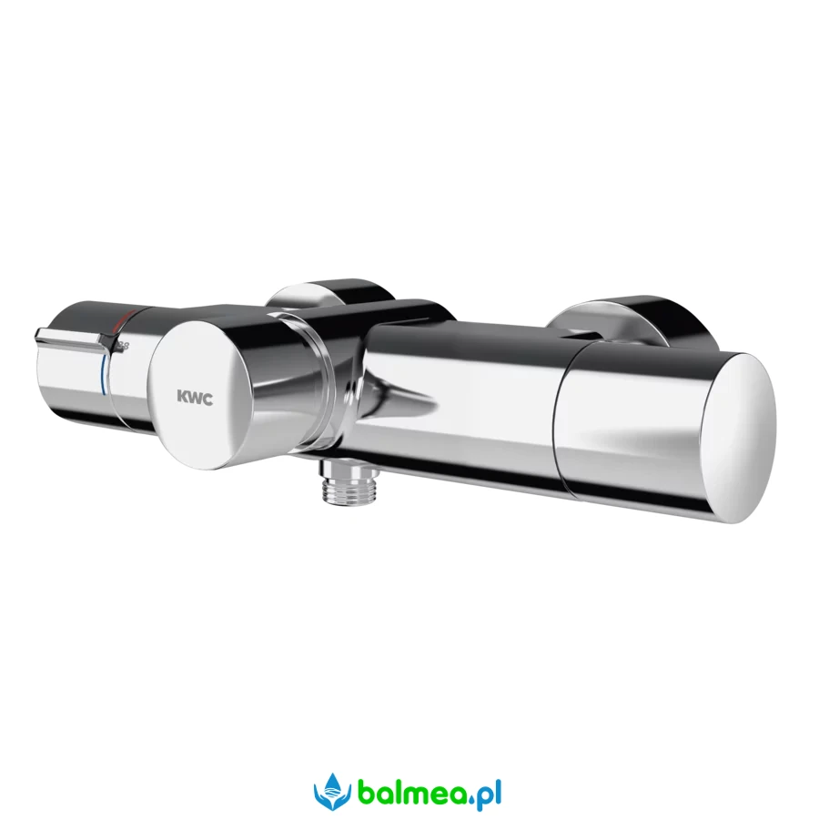 Samozamykająca termostatyczna bateria ścienna DN 15 przeznaczona do montażu natynkowego w strefach natryskowych. Sterowana hydraulicznie, przystosowana do podłączenia do instalacji ciepłej i zimnej wody.